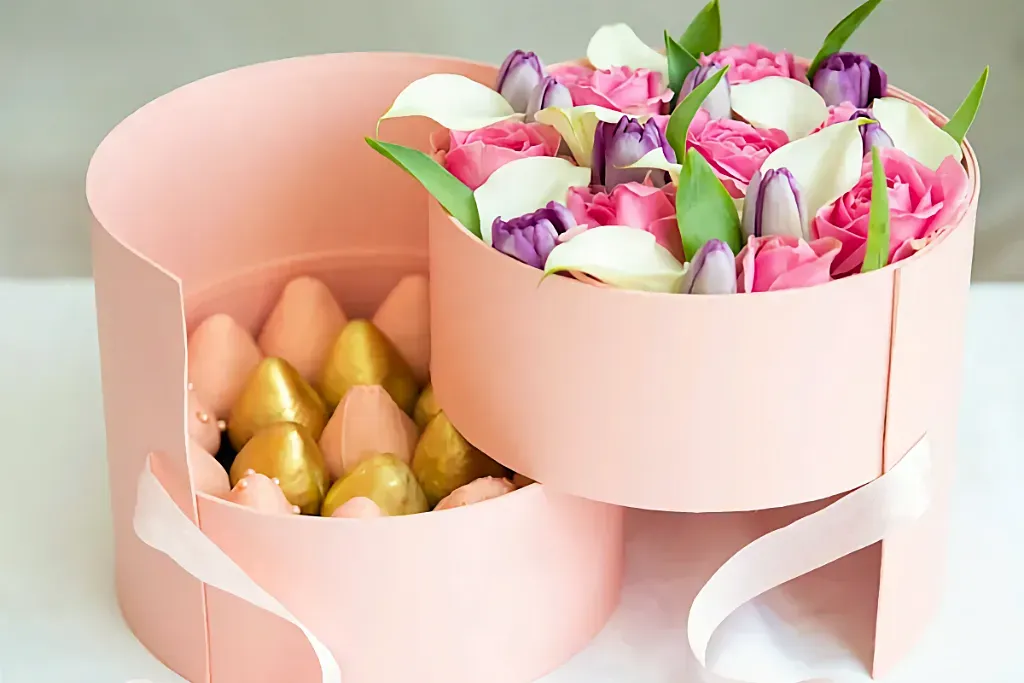 Стандартная флористическая шкатулка имеет форму вытянутого цилиндра. Это позволяет разместить в ней разные цветы, а также угощения на высоких шпажках. В композицию всегда можно добавить любые элементы, чтобы разнообразить букет.
